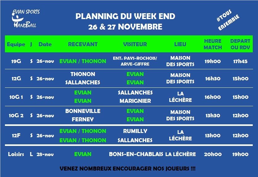 NOUS VOUS INFORMONS QUE LE PLANNING DES MATCHS DE TOUTES LES EQUIPES POUR LA PERIODE DE NOVEMBRE-DECEMBRE EST EN LIGNE (mis à jour régulièrement), vous pouvez le découvrir dès maintenant en cliquant ICI